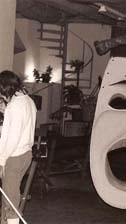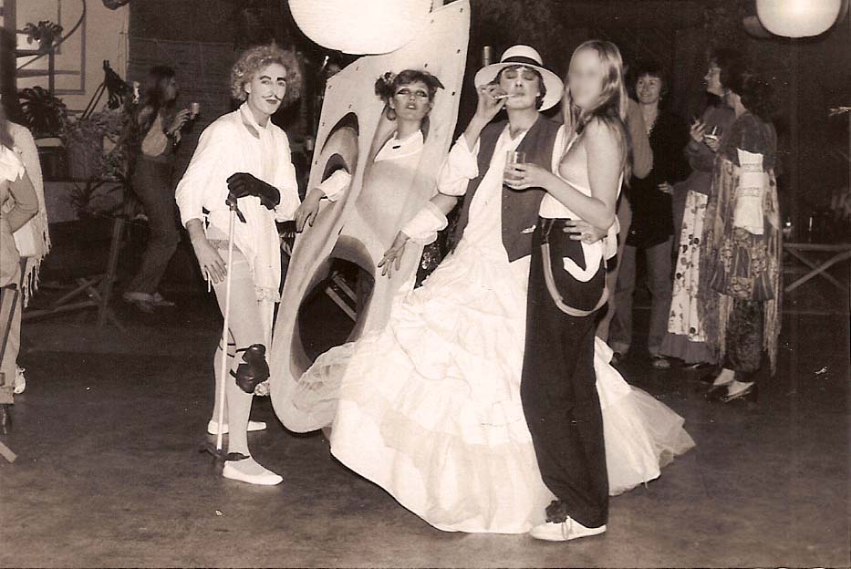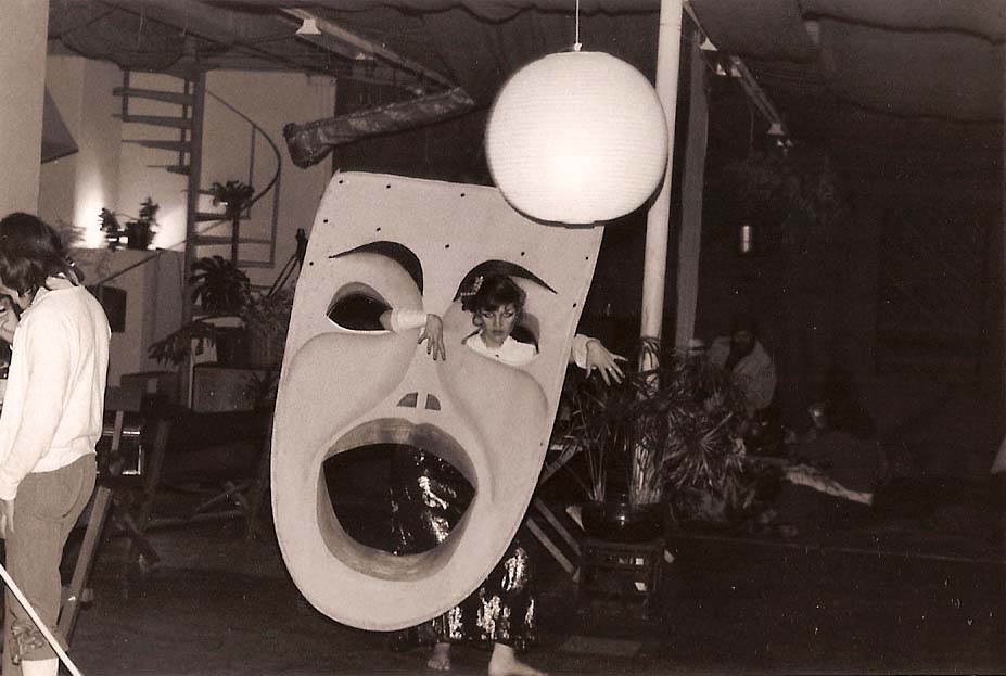 This is not how we normally dressed... well... sometimes... but this was a specific fancy dress party. It shows the whole cross-section of the restaurant including the spiral staircase. In case you are worried, Vicki is dressed in a giant mask that represents her 'mind' and she is wearing a shirt with "I've lost my mind" written on it... so that when she put down the mask people would know... that she had lost it... a good example of how obtuse things could get. In the left photo you can just spot renown French sculpture Frederick Chapeaux in the dark to the right of the pole.