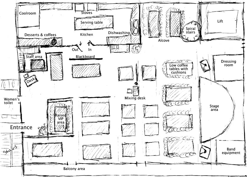 In those last couple of years Simon built a special VIP area near the entrance at the back of the room. It was a raised area sitting up on three layers of milk crates (just over a metre high) covered in boards and carpets with a low coffee table in the middle. It was an area reserved for special guests, celebrities, managers, promoters and well, for Simon, where you had a clear view down to the stage with a nice stereo position. You could also enter and exit the restaurant quickly and easily without being noticed as much. Simon, who had previously done interior design, also covered the whole ugly ceiling with rolls and rolls of hanging Hessian that ran right down the back of the stage and created a 'womb' feel as well as better acoustics.