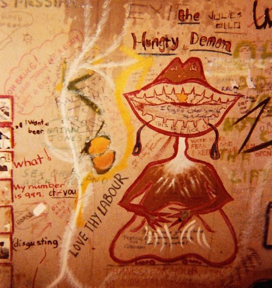 If you managed to find the entrance there was then a long hike up 6 flights of stairs. Ken knew from the start that the stairs would end up with all sorts of graffiti, so he commissioned some artist/friends of his to help him paint murals and poetry and sayings on the walls, especially Monty Python graffiti.