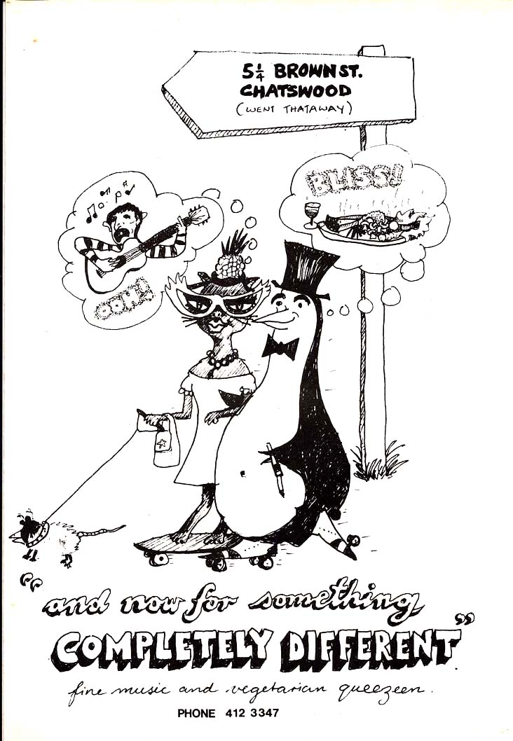 And Now For Something Completely Different was a vegetarian restaurant venue that existed from around 1975 to 1981 in Chatswood on the North Shore of Sydney, Australia. It was also known as 'The Diff' and to those who knew it, it was just known as 'the vegy restaurant' or even just 'the restaurant'. I will also shorten it here to its smallest common abbreviation - ANFSCD.