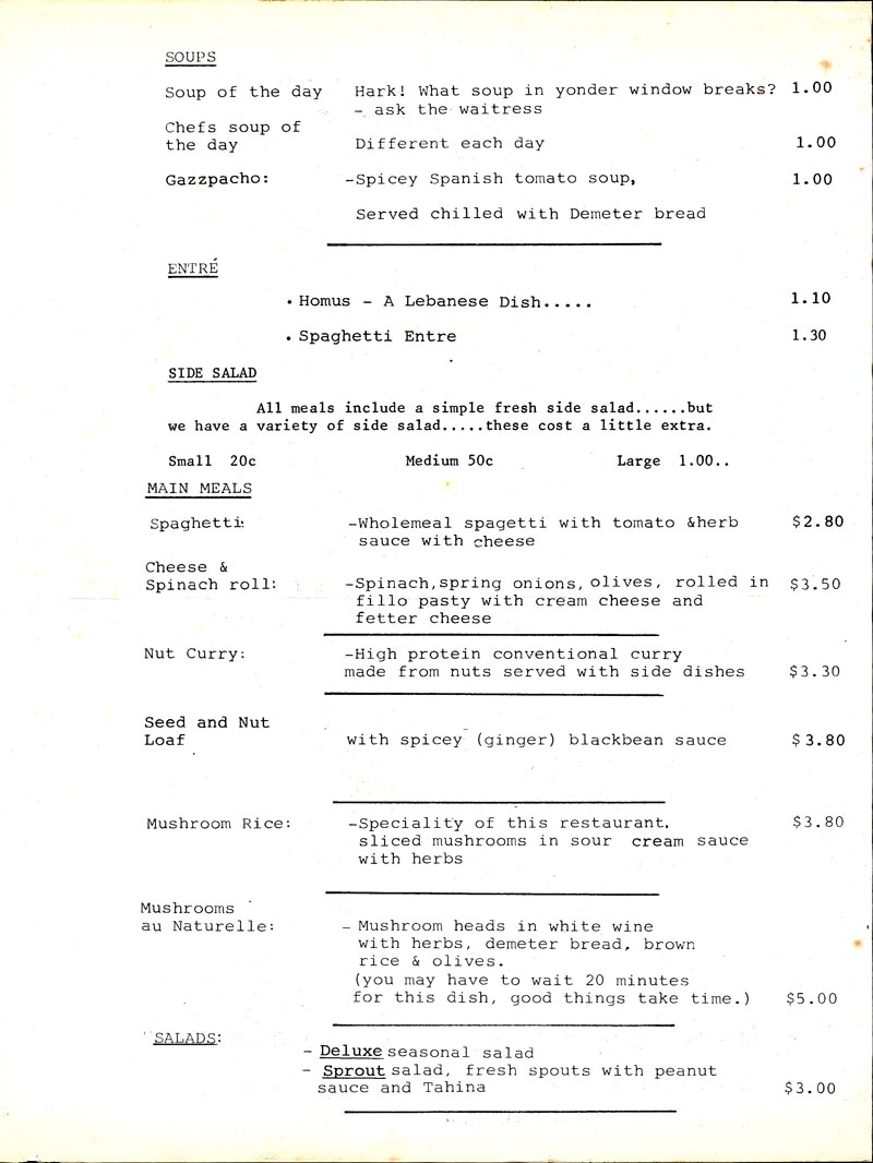You can read Simon's story but here is a quick bit of history as I remember it: About halfway through the life of And Now For Something Completely Different the stress of it all started catching up with Ken whose marriage split up over the restaurant and he started to lose connection with it. I ran away to the country for a while. At that time there was an astute cook working there named Simon Brink who saw this as an opportunity to buy in to the business and he bought a half share. Simon then took over as manager and began the second half of The Diff's life, more as a funky venue - with vegy food.