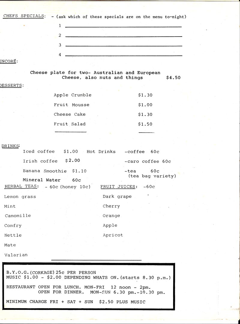 What you will find here is an organically growing archive website of memories and dreams from the staff, performers and customers who worked, played in and loved this phenomenal and unique space. It was full of creative dreamers who brought an inspiring diet of food and music to the people of Sydney.